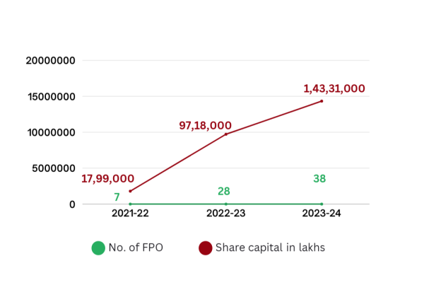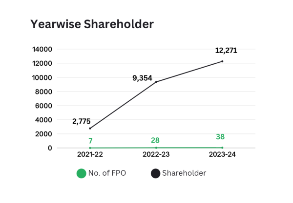 In the fiscal year 2022-23, the member base increased by 237%, and the share capital grew by 440%. Conversely, in 2023-24, there was a 31% increase in the member base and a 47% rise in share capital. Given the nascent stage of FPOs in 2021-22, the subsequent year witnessed significant growth. Sustaining the growth rate of 2023-24 is crucial to achieving economies of scale.