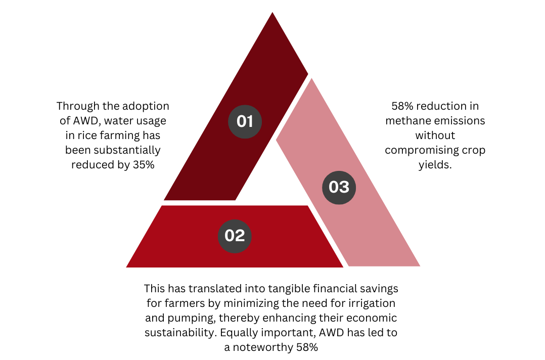 Training on AWD Method: training sessions were conducted to equip farmers with the knowledge and skills required to implement the AWD method effectively